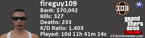 <a href="http://GTAonlinestats.com/showplayer/fireguy109"><img src="http://GTAonlinestats.com/randomsignature/fireguy109/sig.png" alt="fireguy109" border="0" /></a>
