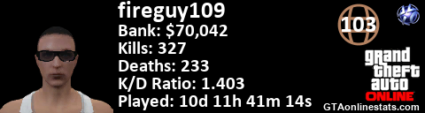 [URL=http://GTAonlinestats.com/showplayer/fireguy109][IMG]http://GTAonlinestats.com/signature/fireguy109/sig.png[/IMG][/URL]