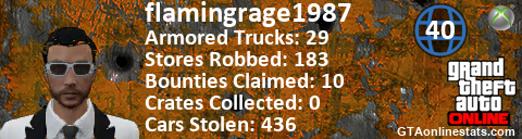 <a href="http://GTAonlinestats.com/showplayer/flamingrage1987"><img src="http://GTAonlinestats.com/crimesignature/flamingrage1987/sig.png" alt="flamingrage1987" border="0" /></a>
