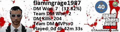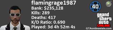 [URL=http://GTAonlinestats.com/showplayer/flamingrage1987][IMG]http://GTAonlinestats.com/signature/flamingrage1987/sig.png[/IMG][/URL]