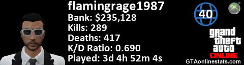 <a href="http://GTAonlinestats.com/showplayer/flamingrage1987"><img src="http://GTAonlinestats.com/greysignature/flamingrage1987/sig.png" alt="flamingrage1987" border="0" /></a>
