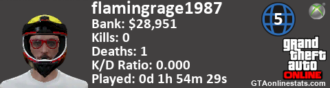 <a href="http://GTAonlinestats.com/showplayer/flamingrage1987/2"><img src="http://GTAonlinestats.com/signature/flamingrage1987/2/sig.png" alt="flamingrage1987" border="0" /></a>