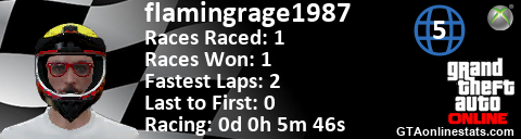 <a href="http://GTAonlinestats.com/showplayer/flamingrage1987/2"><img src="http://GTAonlinestats.com/racesignature/flamingrage1987/2/sig.png" alt="flamingrage1987" border="0" /></a>