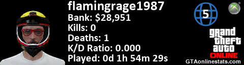 [URL=http://GTAonlinestats.com/showplayer/flamingrage1987/2][IMG]http://GTAonlinestats.com/signature/flamingrage1987/2/sig.png[/IMG][/URL]