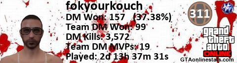 <a href="http://GTAonlinestats.com/showplayer/fokyourkouch"><img src="http://GTAonlinestats.com/dmsignature/fokyourkouch/sig.png" alt="fokyourkouch" border="0" /></a>
