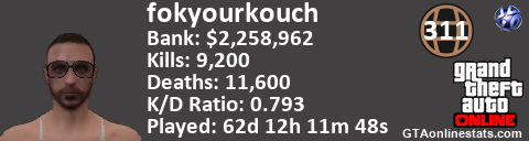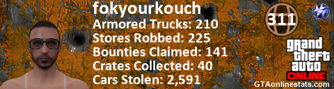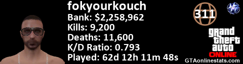<a href="http://GTAonlinestats.com/showplayer/fokyourkouch"><img src="http://GTAonlinestats.com/randomsignature/fokyourkouch/sig.png" alt="fokyourkouch" border="0" /></a>