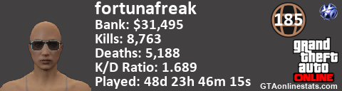 <a href="http://GTAonlinestats.com/showplayer/fortunafreak"><img src="http://GTAonlinestats.com/signature/fortunafreak/sig.png" alt="fortunafreak" border="0" /></a>