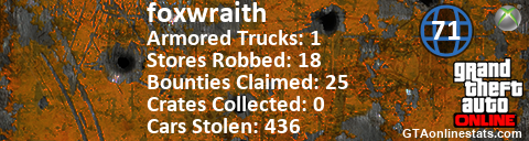 [URL=http://GTAonlinestats.com/showplayer/foxwraith][IMG]http://GTAonlinestats.com/crimesignature/foxwraith/sig.png[/IMG][/URL]