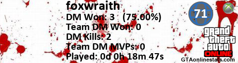 [URL=http://GTAonlinestats.com/showplayer/foxwraith][IMG]http://GTAonlinestats.com/dmsignature/foxwraith/sig.png[/IMG][/URL]