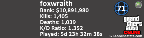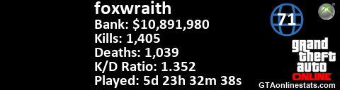 [URL=http://GTAonlinestats.com/showplayer/foxwraith][IMG]http://GTAonlinestats.com/signature/foxwraith/sig.png[/IMG][/URL]
