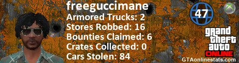 [URL=http://GTAonlinestats.com/showplayer/freeguccimane][IMG]http://GTAonlinestats.com/crimesignature/freeguccimane/sig.png[/IMG][/URL]