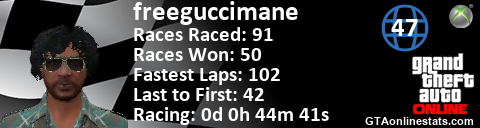 [URL=http://GTAonlinestats.com/showplayer/freeguccimane][IMG]http://GTAonlinestats.com/racesignature/freeguccimane/sig.png[/IMG][/URL]