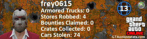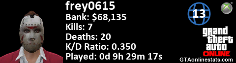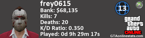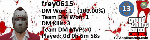 <a href="http://GTAonlinestats.com/showplayer/frey0615"><img src="http://GTAonlinestats.com/randomsignature/frey0615/sig.png" alt="Frey0615" border="0" /></a>