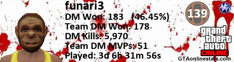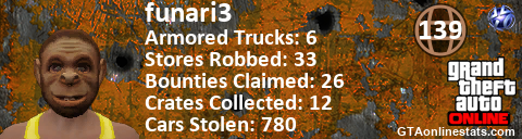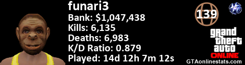 [URL=http://GTAonlinestats.com/showplayer/funari3][IMG]http://GTAonlinestats.com/signature/funari3/sig.png[/IMG][/URL]