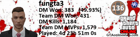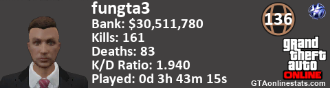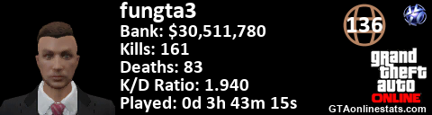 [URL=http://GTAonlinestats.com/showplayer/fungta3][IMG]http://GTAonlinestats.com/signature/fungta3/sig.png[/IMG][/URL]