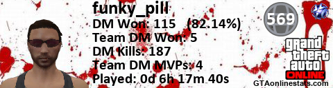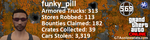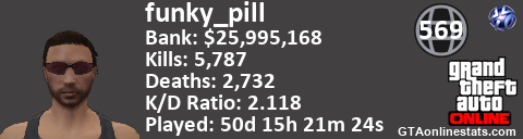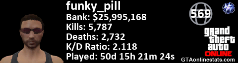 [URL=http://GTAonlinestats.com/showplayer/funky_pill/2][IMG]http://GTAonlinestats.com/dmsignature/funky_pill/2/sig.png[/IMG][/URL]