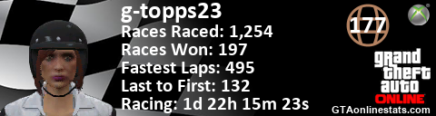 [URL=http://GTAonlinestats.com/showplayer/g-topps23][IMG]http://GTAonlinestats.com/racesignature/g-topps23/sig.png[/IMG][/URL]