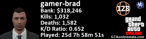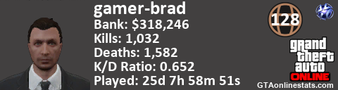 <a href="http://GTAonlinestats.com/showplayer/gamer-brad"><img src="http://GTAonlinestats.com/dmsignature/gamer-brad/sig.png" alt="gamer-brad" border="0" /></a>