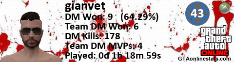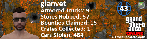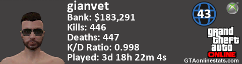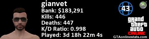 [URL=http://GTAonlinestats.com/showplayer/gianvet][IMG]http://GTAonlinestats.com/signature/gianvet/sig.png[/IMG][/URL]