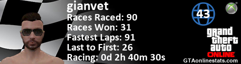 [URL=http://GTAonlinestats.com/showplayer/gianvet][IMG]http://GTAonlinestats.com/racesignature/gianvet/sig.png[/IMG][/URL]