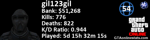 <a href="http://GTAonlinestats.com/showplayer/gil123gil"><img src="http://GTAonlinestats.com/randomsignature/gil123gil/sig.png" alt="Gil123Gil" border="0" /></a>