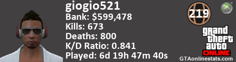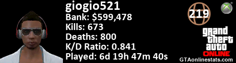 <a href="http://GTAonlinestats.com/showplayer/giogio521"><img src="http://GTAonlinestats.com/signature/giogio521/sig.png" alt="giogio521" border="0" /></a>