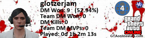 [URL=http://GTAonlinestats.com/showplayer/glotzerjam/2][IMG]http://GTAonlinestats.com/dmsignature/glotzerjam/2/sig.png[/IMG][/URL]