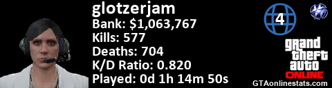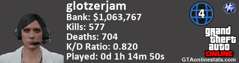 [URL=http://GTAonlinestats.com/showplayer/glotzerjam/2][IMG]http://GTAonlinestats.com/signature/glotzerjam/2/sig.png[/IMG][/URL]