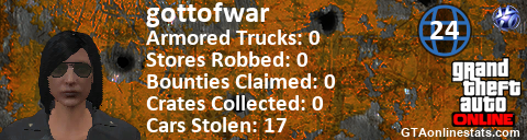 [URL=http://GTAonlinestats.com/showplayer/gottofwar/2][IMG]http://GTAonlinestats.com/crimesignature/gottofwar/2/sig.png[/IMG][/URL]