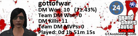 [URL=http://GTAonlinestats.com/showplayer/gottofwar/2][IMG]http://GTAonlinestats.com/dmsignature/gottofwar/2/sig.png[/IMG][/URL]
