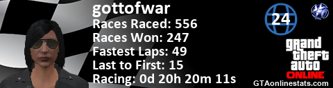 [URL=http://GTAonlinestats.com/showplayer/gottofwar/2][IMG]http://GTAonlinestats.com/racesignature/gottofwar/2/sig.png[/IMG][/URL]