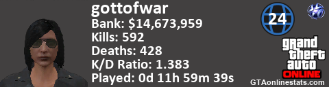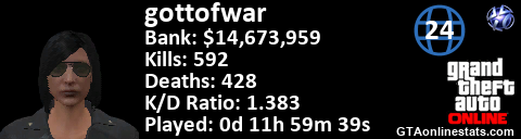 [URL=http://GTAonlinestats.com/showplayer/gottofwar/2][IMG]http://GTAonlinestats.com/signature/gottofwar/2/sig.png[/IMG][/URL]