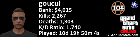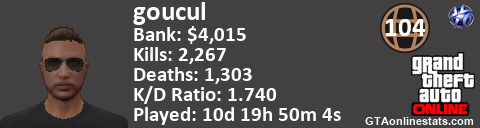 <a href="http://GTAonlinestats.com/showplayer/goucul"><img src="http://GTAonlinestats.com/signature/goucul/sig.png" alt="goucul" border="0" /></a>