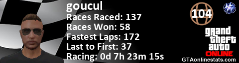 [URL=http://GTAonlinestats.com/showplayer/goucul][IMG]http://GTAonlinestats.com/racesignature/goucul/sig.png[/IMG][/URL]