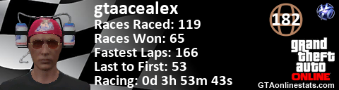 [URL=http://GTAonlinestats.com/showplayer/gtaacealex][IMG]http://GTAonlinestats.com/racesignature/gtaacealex/sig.png[/IMG][/URL]