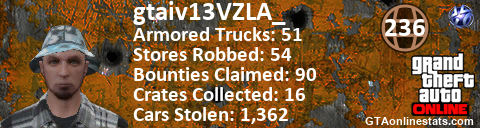 [URL=http://GTAonlinestats.com/showplayer/gtaiv13VZLA_][IMG]http://GTAonlinestats.com/crimesignature/gtaiv13VZLA_/sig.png[/IMG][/URL]
