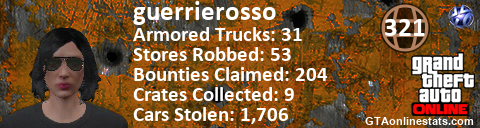 [URL=http://GTAonlinestats.com/showplayer/guerrierosso][IMG]http://GTAonlinestats.com/crimesignature/guerrierosso/sig.png[/IMG][/URL]