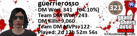 [URL=http://GTAonlinestats.com/showplayer/guerrierosso][IMG]http://GTAonlinestats.com/dmsignature/guerrierosso/sig.png[/IMG][/URL]
