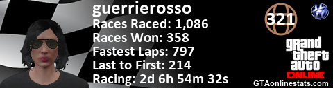 [URL=http://GTAonlinestats.com/showplayer/guerrierosso][IMG]http://GTAonlinestats.com/racesignature/guerrierosso/sig.png[/IMG][/URL]