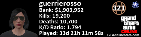 [URL=http://GTAonlinestats.com/showplayer/guerrierosso][IMG]http://GTAonlinestats.com/signature/guerrierosso/sig.png[/IMG][/URL]
