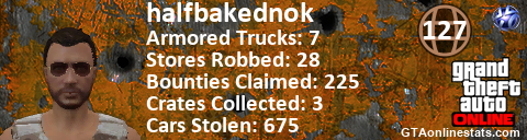 [URL=http://GTAonlinestats.com/showplayer/halfbakednok][IMG]http://GTAonlinestats.com/randomsignature/halfbakednok/sig.png[/IMG][/URL]