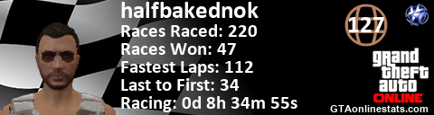 <a href="http://GTAonlinestats.com/showplayer/halfbakednok"><img src="http://GTAonlinestats.com/racesignature/halfbakednok/sig.png" alt="halfbakednok" border="0" /></a>
