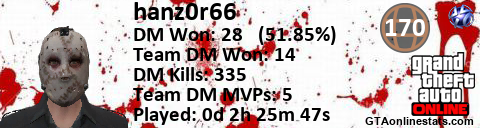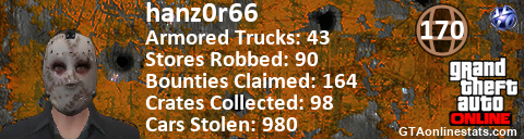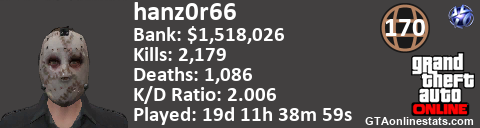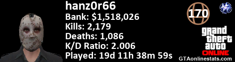 <a href="http://GTAonlinestats.com/showplayer/hanz0r66"><img src="http://GTAonlinestats.com/dmsignature/hanz0r66/sig.png" alt="hanz0r66" border="0" /></a>