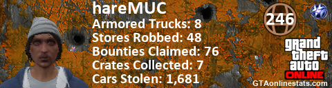 [URL=http://GTAonlinestats.com/showplayer/hareMUC][IMG]http://GTAonlinestats.com/crimesignature/hareMUC/sig.png[/IMG][/URL]