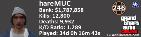 [URL=http://GTAonlinestats.com/showplayer/hareMUC][IMG]http://GTAonlinestats.com/signature/hareMUC/sig.png[/IMG][/URL]