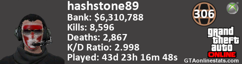 <a href="http://GTAonlinestats.com/showplayer/hashstone89"><img src="http://GTAonlinestats.com/greysignature/hashstone89/sig.png" alt="hashstone89" border="0" /></a>
