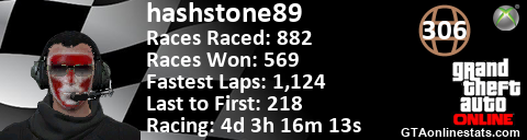 <a href="http://GTAonlinestats.com/showplayer/hashstone89"><img src="http://GTAonlinestats.com/racesignature/hashstone89/sig.png" alt="hashstone89" border="0" /></a>