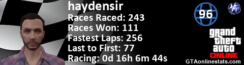 [URL=http://GTAonlinestats.com/showplayer/haydensir][IMG]http://GTAonlinestats.com/racesignature/haydensir/sig.png[/IMG][/URL]