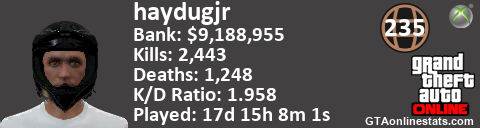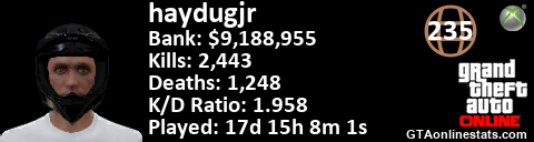 [URL=http://GTAonlinestats.com/showplayer/haydugjr/2][IMG]http://GTAonlinestats.com/greysignature/haydugjr/2/sig.png[/IMG][/URL]