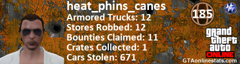 <a href="http://GTAonlinestats.com/showplayer/heat_phins_canes"><img src="http://GTAonlinestats.com/randomsignature/heat_phins_canes/sig.png" alt="heat_phins_canes" border="0" /></a>